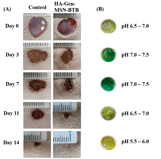 在臨床傷口護(hù)理中,實(shí)時(shí)監(jiān)測(cè)創(chuàng)面的愈合進(jìn)程對(duì)評(píng)估愈合狀態(tài)及預(yù)防感染至關(guān)重要。近日,孔泳教授課題組和嘉興大學(xué)、常州中醫(yī)醫(yī)院相關(guān)課題組合作,開(kāi)發(fā)出一種“可示蹤”智能水凝膠用于傷口治療。透明質(zhì)酸和慶大霉素通過(guò)酰胺鍵形成水凝膠,負(fù)載了pH指示劑的介孔二氧化硅通過(guò)靜電作用和氫鍵與水凝膠結(jié)合。水凝膠可通過(guò)酰胺鍵的水解實(shí)現(xiàn)自降解,從而釋放慶大霉素有效抗菌。另外,負(fù)載的pH指示劑顏色會(huì)隨傷口微環(huán)境pH值變化而改變,可實(shí)現(xiàn)可視化監(jiān)測(cè)傷口愈合進(jìn)程,避免了頻繁的采樣、分析過(guò)程。本項(xiàng)工作發(fā)表于A(yíng)nal. Chem. (Anal. Chem. 2026, 98, 1607?1616)。
