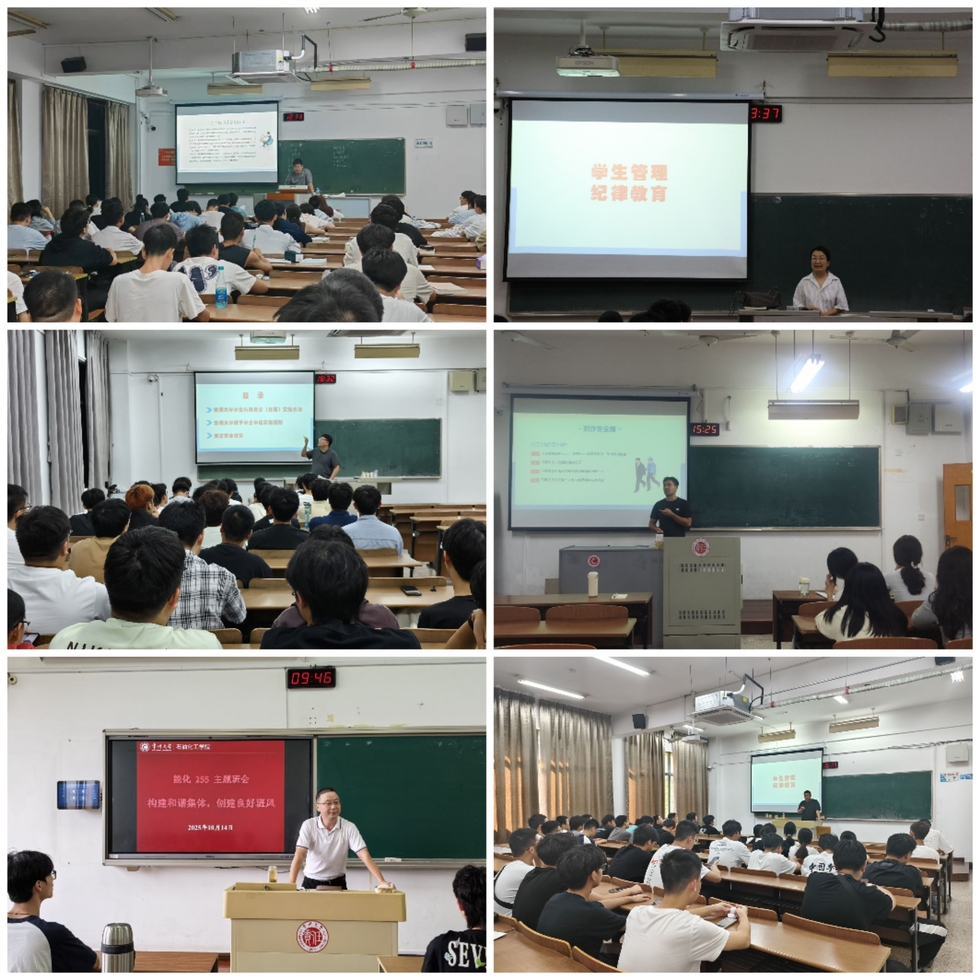 • 為幫助2025級(jí)新生盡快適應(yīng)大學(xué)生活,樹(shù)立正確的世界觀(guān)、人生觀(guān)、價(jià)值觀(guān),近日,我院精心策劃并順利開(kāi)展了系列新生入學(xué)教育活動(dòng)。本次教育活動(dòng)涵蓋校史校情、規(guī)章制度、專(zhuān)業(yè)認(rèn)知、安全防范等多個(gè)模塊,通過(guò)專(zhuān)題講座、互動(dòng)體驗(yàn)等多種形式,為新生們搭建了認(rèn)知大學(xué)、融入集體的“第一堂課”,助力他們?cè)谛碌娜松A段開(kāi)好局、起好步。暖心交流,共啟新程——班主任見(jiàn)面會(huì)為幫助新生快速適應(yīng)大學(xué)學(xué)習(xí)生活、明確成長(zhǎng)發(fā)展方向,9月7日,我院各新生班級(jí)陸續(xù)召開(kāi)班主任見(jiàn)面會(huì)。各班班主任與全體新生齊聚一堂,開(kāi)啟大學(xué)階段師生間的首次深度交流。見(jiàn)面會(huì)上,班主任們從個(gè)人專(zhuān)業(yè)背景、核心教學(xué)方向到學(xué)術(shù)研究經(jīng)歷,結(jié)合自身從教經(jīng)驗(yàn)與往屆學(xué)生案例,分享時(shí)間管理方法、人際交往技巧及學(xué)業(yè)與生活平衡的實(shí)用策略,為新生提供全方位的適應(yīng)指引。他們鼓勵(lì)新生既要扎實(shí)掌握專(zhuān)業(yè)理論知識(shí),筑牢學(xué)習(xí)根基,也要主動(dòng)參與學(xué)科競(jìng)賽、社團(tuán)實(shí)踐與科研項(xiàng)目,在實(shí)踐中鍛煉綜合能力。啟航大學(xué)夢(mèng),從‘心’認(rèn)專(zhuān)業(yè)——專(zhuān)業(yè)思想教育為幫助新生增強(qiáng)專(zhuān)業(yè)認(rèn)知,堅(jiān)定專(zhuān)業(yè)信念,明確發(fā)展方向我院于9月17日、9月21日、9月23日分別開(kāi)展各專(zhuān)業(yè)思想教育,各專(zhuān)業(yè)負(fù)責(zé)人石劍、吳大同、文成龍參加。他們結(jié)