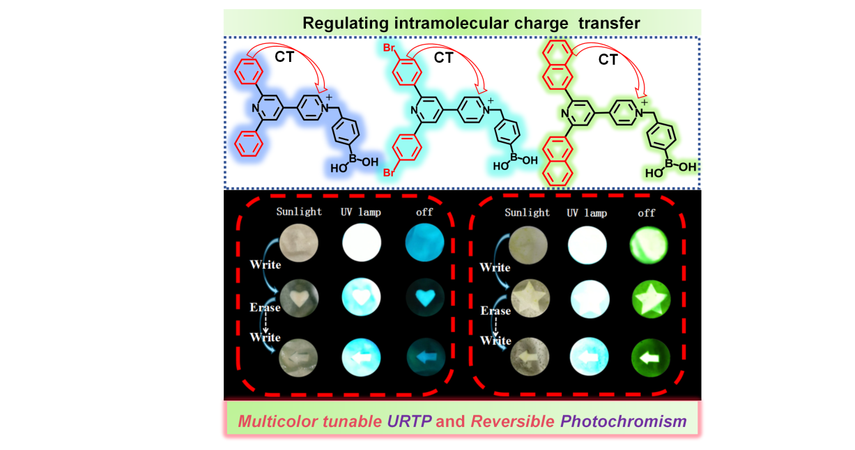 • 動(dòng)態(tài)光致變色長(zhǎng)壽命室溫磷光材料是一類(lèi)兼具結(jié)構(gòu)色變化與發(fā)光特性可調(diào)(強(qiáng)度、壽命及顏色)的智能光學(xué)材料,在高級(jí)防偽、信息加密、傳感等領(lǐng)域具有巨大應(yīng)用潛能。然而,如何將光致變色和長(zhǎng)壽命室溫磷光功能有效整合到單一聚合物體系,以構(gòu)筑出多色可調(diào)的高性能的動(dòng)態(tài)光致變色長(zhǎng)壽命室溫磷光聚合物,仍面臨巨大挑戰(zhàn)。我們研究團(tuán)隊(duì)策略性地將具有可調(diào)控分子內(nèi)電荷轉(zhuǎn)移(ICT)能力的非線(xiàn)性吡啶鎓單元嵌入剛性聚乙烯醇(PVA)基質(zhì)中,成功地開(kāi)發(fā)了多色可調(diào)的動(dòng)態(tài)光致變色長(zhǎng)壽命室溫磷光聚合物。圖1 多功能吡啶鎓單元結(jié)構(gòu)圖及其摻雜聚合物膜應(yīng)用圖結(jié)合多種光譜分析表明,這類(lèi)多功能吡啶鎓單元受光激發(fā),誘導(dǎo)ICT驅(qū)動(dòng)的電荷分離,可形成具有不同能量的長(zhǎng)壽命三線(xiàn)態(tài)電荷轉(zhuǎn)移(CT)態(tài),從而可實(shí)現(xiàn)多色長(zhǎng)壽命室溫磷光發(fā)射。PVA基質(zhì)不僅穩(wěn)定了這些三線(xiàn)態(tài)CT態(tài),還促進(jìn)了CT介導(dǎo)的從羥基到吡啶鎓受體的電子轉(zhuǎn)移,產(chǎn)生具有可逆光致變色行為的穩(wěn)定自由基。此外,通過(guò)硼酸交聯(lián)吡啶鎓摻雜的PVA網(wǎng)絡(luò),所構(gòu)筑的聚合物體系在保持高對(duì)比度可逆光致變色行為的同時(shí),將磷光壽命(提升至0.96秒)與量子效率(提高至27.8%)明顯提升。這類(lèi)多功能聚合物薄膜在多重防偽、可