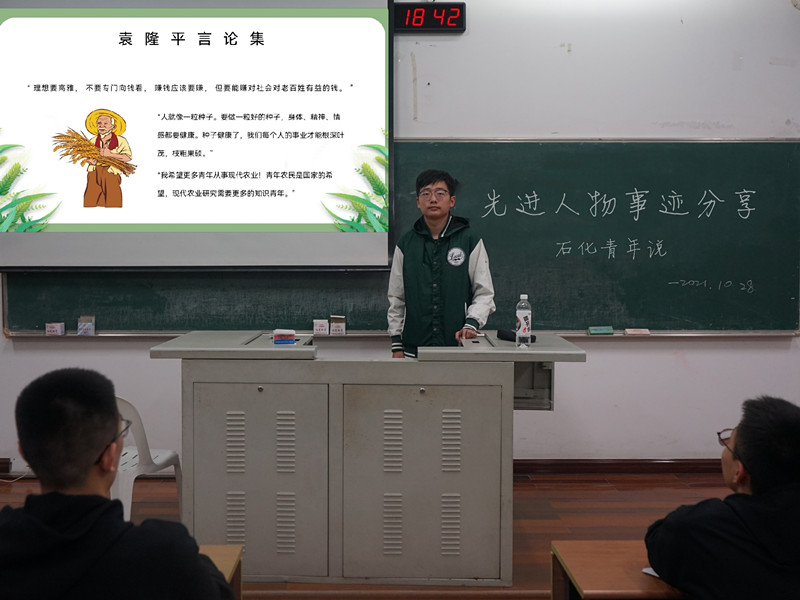 分享會(huì )上,許涵僑簡(jiǎn)要介紹“石化青年說(shuō)”的基本內涵后,主講人湯越詳細地講述袁隆平同志的生平和貢獻,著(zhù)重分享袁隆平先生的精彩言論集,并以此呼吁廣大青年傳承袁隆平先生的偉人精神。
