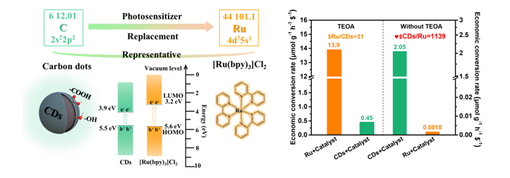課題組基于MOFs材料構建“多核殼催化劑”,由ZIF-67@MIL-68(In)誘導生成CDs/Co3O4/In2O3納米管。研究發(fā)現,CDs(碳點(diǎn))基催化劑在不添加犧牲劑TEOA(三乙醇胺)的條件下,光催化CO2還原性能優(yōu)于吡啶釕基催化劑。在這一體系中,碳點(diǎn)可以有效替代貴金屬催化劑取得良好的光催化性能。此項研究得到了江蘇省優(yōu)秀青年基金,國家自然科學(xué)基金的支持。