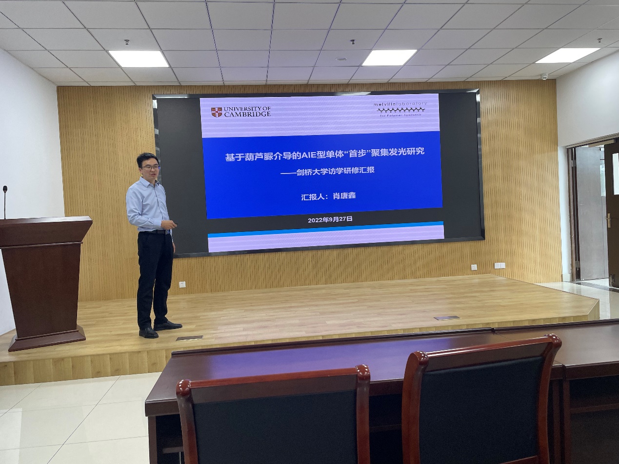 肖唐鑫老師作了“葫蘆脲介導的AIE型單體首步聚集發(fā)光研究”的報告,他于2021年3月-2022年6月受?chē)伊魧W(xué)基金委資助赴英國劍橋大學(xué)化學(xué)系研修。在報告中,肖老師介紹了訪(fǎng)學(xué)的申請過(guò)程、訪(fǎng)問(wèn)期間的學(xué)術(shù)研究?jì)热?,還和大家分享了在劍橋的見(jiàn)聞。