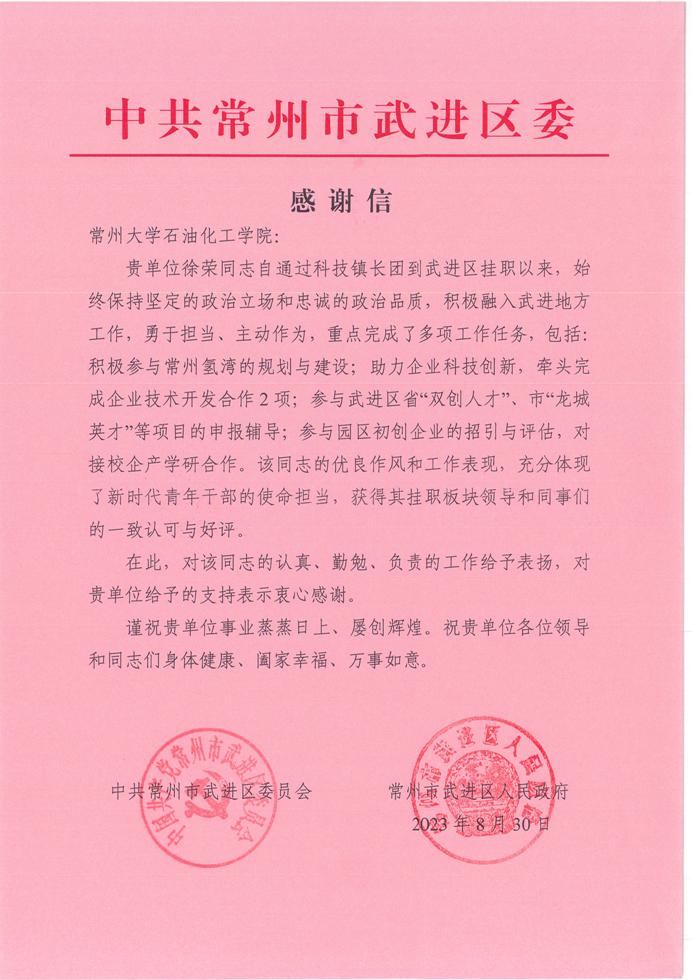 近日,我院收到來(lái)自中共常州市武進(jìn)區委的感謝信。信中對我院徐榮同志在武進(jìn)區掛職工作過(guò)程中,勇于擔當、主動(dòng)作為、認真勤勉的工作作風(fēng),以及善于溝通協(xié)調、專(zhuān)業(yè)技能過(guò)硬的綜合能力,予以認可和表?yè)P,并致以衷心的感謝。