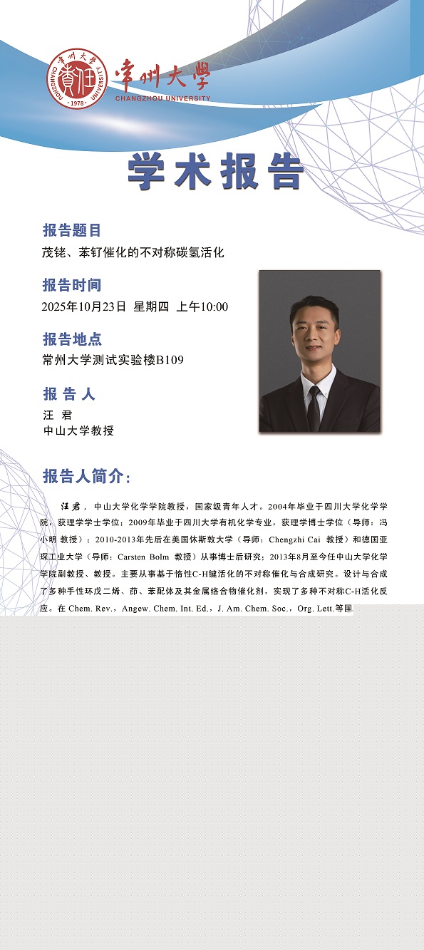 【學(xué)術(shù)報告】10月23日自然與合成有機化學(xué)研究院學(xué)術(shù)報告——汪君教授 中山大學(xué)