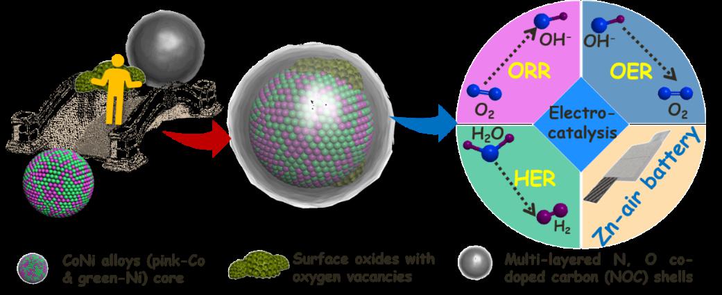 氧氣還原、氧氣析出以及氫氣析出等小分子電催化反應是鋅空氣電池、鋰空氣電池、燃料電池以及電化學(xué)分解水制氫等能量存儲與轉換技術(shù)的核心反應,然而它們均是動(dòng)力學(xué)慢反應,都需要使用催化劑來(lái)加速它們的反應,從而提高存儲和轉換效率。在單一催化劑上實(shí)現多功能電催化一直是該領(lǐng)域研究的熱點(diǎn)和重點(diǎn),這對于降低上述能量存儲與轉換器件結構的復雜性、大幅度提高性能,促進(jìn)它們的產(chǎn)業(yè)化都具有重要意義。銀鳳翔-陳標華課題組的何小波副研究員利用CoNi-雙金屬有機骨架材料為前驅體,開(kāi)發(fā)了一種“表面輕微氧化的CoNi 合金@氮/氧共摻雜碳”的多功能催化劑。這種多功能催化劑擁有媲美于貴金屬催化劑的氧氣還原、氧氣析出以及氫氣析出的高效電催化性能。更為突出的是,這種電催化劑使得鋅空氣電池擁有98.6%的理論比容量和74.8%的理論能量密度,并且超過(guò)100小時(shí)運行后鋅空氣電池的性能幾乎沒(méi)有衰減。深入的構-效關(guān)系研究發(fā)現,該催化劑中CoNi合金納米顆粒表面存在的少量氧化層起到了關(guān)鍵作用。這種關(guān)鍵作用主要體現在以下兩個(gè)方面:(一)少量氧化層“富含”氧空位,氧空位促進(jìn)了從CoNi合金納米顆粒(核心)到氮/氧共摻雜碳(外殼)的電子轉移,從而優(yōu)化了在電催化過(guò)程中起直接催化作用的氮/氧共摻雜碳中活性位的電子結構及其對反應物種的吸脫附能力,最終使得CoNi合金納米顆粒(核心)和氮/氧共摻雜碳(外殼)在多功能電催化過(guò)程中能夠分別“間接”與“直接”地貢獻各自的作用;(二)“富含”氧空位的少量氧化層還增強了催化劑的整體導電性,從而促進(jìn)了催化劑、電解液與氣態(tài)反應物(產(chǎn)物)之間的三相界面電荷轉移,最終有利于加速多功能電催化反應過(guò)程。
