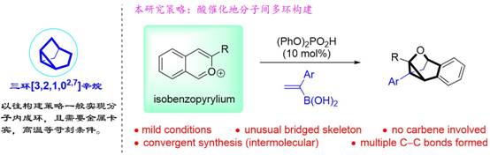 近日,黃海教授與孫建偉教授課題組在Angew. Chem. Int. Ed.上發(fā)表題為“A Mild Intermolecular Synthesis ofCyclopropane-Incorporated Tricyclic Skeleton: Unusual Reactivity of Isobenzopyryliums”的研究論文。復雜的結構骨架,特別是帶有張力小環(huán)的骨架結構是天然產(chǎn)物較為多見(jiàn)的母體結構,但是由于結構的復雜性和不穩定性,這一類(lèi)骨架的構建一直以來(lái)是具有挑戰性的工作。例如,三環(huán)[3,2,1,02,7]辛烷就是這樣一類(lèi)復雜又帶有張力小環(huán)的骨架結構,以往的構建策略都需要涉及金屬卡賓、高溫等苛刻反應條件來(lái)克服動(dòng)力學(xué)或熱力學(xué)不利的問(wèn)題。本論文實(shí)現了一種在普通酸催化下的苯并異吡喃鹽與烯基硼酸連續[4+2]環(huán)加成/關(guān)環(huán)反應,成功構建了氧雜三環(huán)[3,2,1,02,7]辛烷骨架結構。該類(lèi)結構預計在藥物分子中具有潛在的應用價(jià)值。同時(shí),后期合成應用顯示,目標分子具有很高的合成價(jià)值,是一類(lèi)不可或缺的骨架結構。