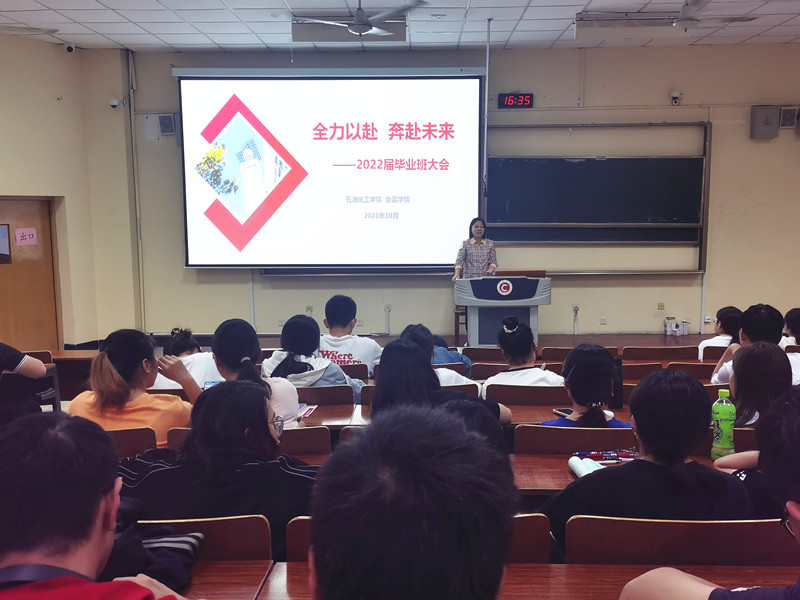 10月14日下午,石油化工學(xué)院食品學(xué)院畢業(yè)班大會(huì )在W5階召開(kāi)。出席本次大會(huì )的有院黨委副書(shū)記宣慧、副院長(cháng)黃海、各專(zhuān)業(yè)輔導員。2022屆全體畢業(yè)生參加此次大會(huì ),會(huì )議由學(xué)工辦主任方俊主持。