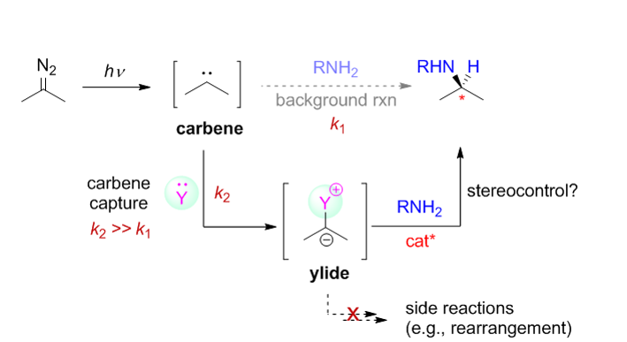 解決方案:如何抑制背景反應以提高有機催化的自由卡賓轉移反應的立體選擇性,是該研究體系所面臨的最重要的科學(xué)問(wèn)題與挑戰?;谖覀冋n題組在有機催化的卡賓類(lèi)似物(硫葉立德)N-H插入反應的研究興趣,我們首先研究了有機催化的可見(jiàn)光介導條件下的自由卡賓不對稱(chēng)N-H插入反應,通過(guò)適當的反應條件優(yōu)化,我們發(fā)現在手性磷酸催化劑存在下,反應最高只能獲得具有中等的立體選擇性的N-H插入產(chǎn)物?;诖饲捌谘芯拷Y果,我們設想能否通過(guò)自由卡賓的間接捕獲思路,即利用含孤對電子的化合物作為添加劑捕獲可見(jiàn)光激發(fā)產(chǎn)生的自由卡賓而原位形成新的葉立德中間體,該葉立德中間體需順利參與手性酸催化的不對稱(chēng)N-H插入反應,從而提高反應的立體選擇性(思路見(jiàn)下圖)。但此思路中,各步反應速率的匹配性以及添加劑與催化反應體系的兼容性是需要額外考慮的問(wèn)題。