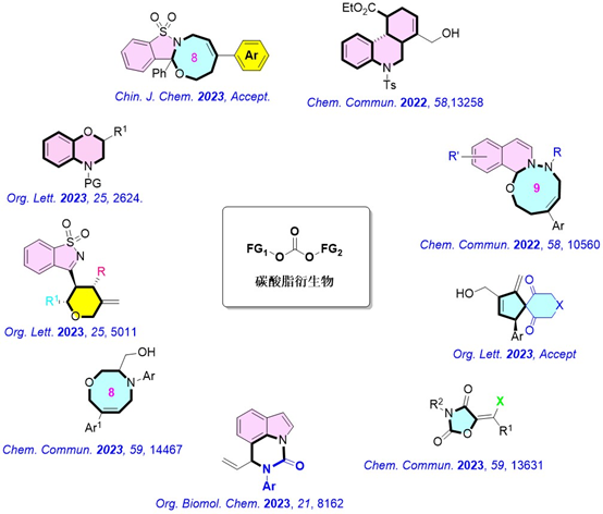 碳酸酯作為一類(lèi)重要的有機合成砌塊,在有機雜環(huán)化合物合成領(lǐng)域具有重要的戰略意義,為很多重要的雜環(huán)化合物分子提供了高效的合成方法。近兩年,孫建偉和黃海團隊圍繞核心分子骨架高效構建,針對于碳酸酯類(lèi)衍生物開(kāi)展了系列的精準轉化研究,包括:對映選擇性環(huán)加成反應、可控性分子內環(huán)合反應、連續多環(huán)化反應等轉化類(lèi)型,為包括中環(huán)化合物等在內的10余種重要雜環(huán)化合物提供的高效構建策略。相關(guān)成果發(fā)表在Org. Lett.; Chem. Commun.; Chin. J. Chem.等知名期刊上。