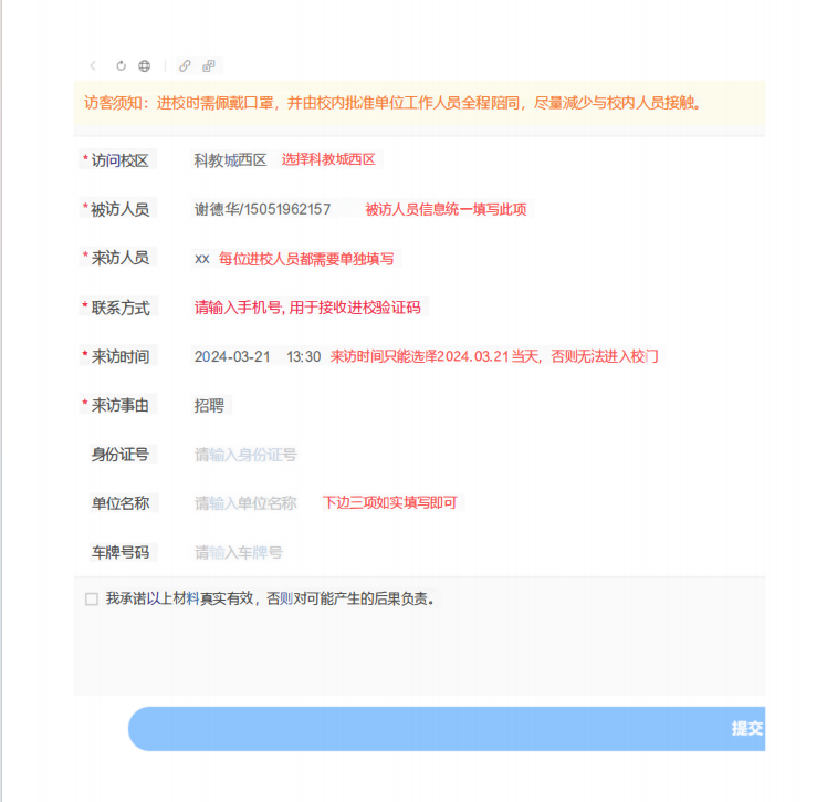 ③信息填寫(xiě)完畢后點(diǎn)擊提交,審核通過(guò)后將收到預約信息登記成功短信并附帶入校鏈接,入校時(shí)請點(diǎn)擊鏈接生成入校二維碼并向門(mén)衛出示即可。