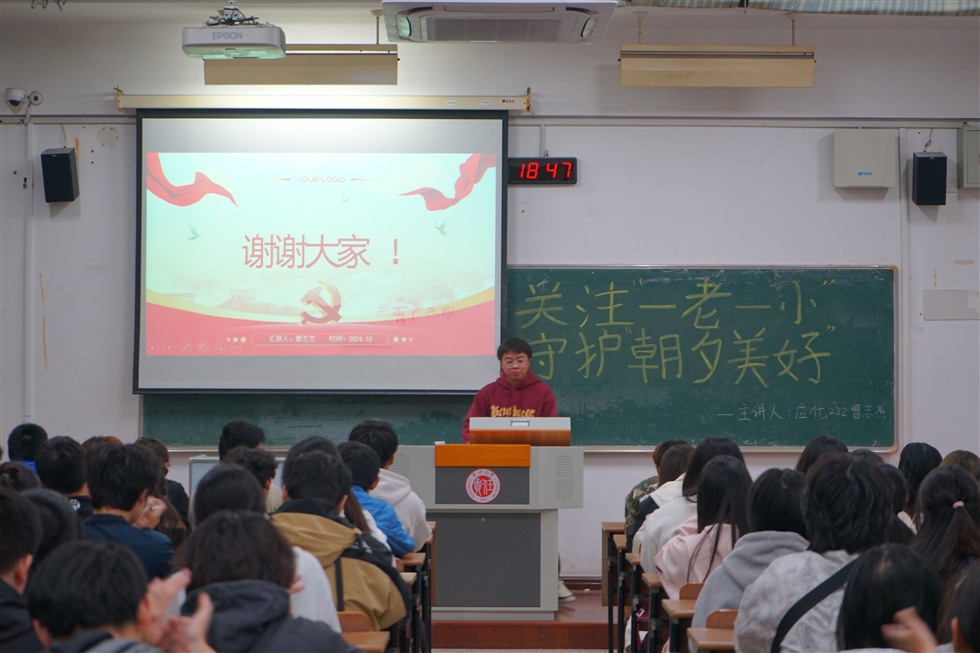 為提升大學(xué)生對老年人和兒童的關(guān)注與關(guān)愛(ài),培養社會(huì )責任感,共同構建和諧美好的社會(huì )環(huán)境,我院于10月29日在W1210教室開(kāi)展了“青年講師團”系列講座第二講——關(guān)注“一老一小”,守護“朝夕美好”。本次活動(dòng)由學(xué)生第二黨支部黨員應化222曹志杰主講,我院學(xué)生代表參加。
