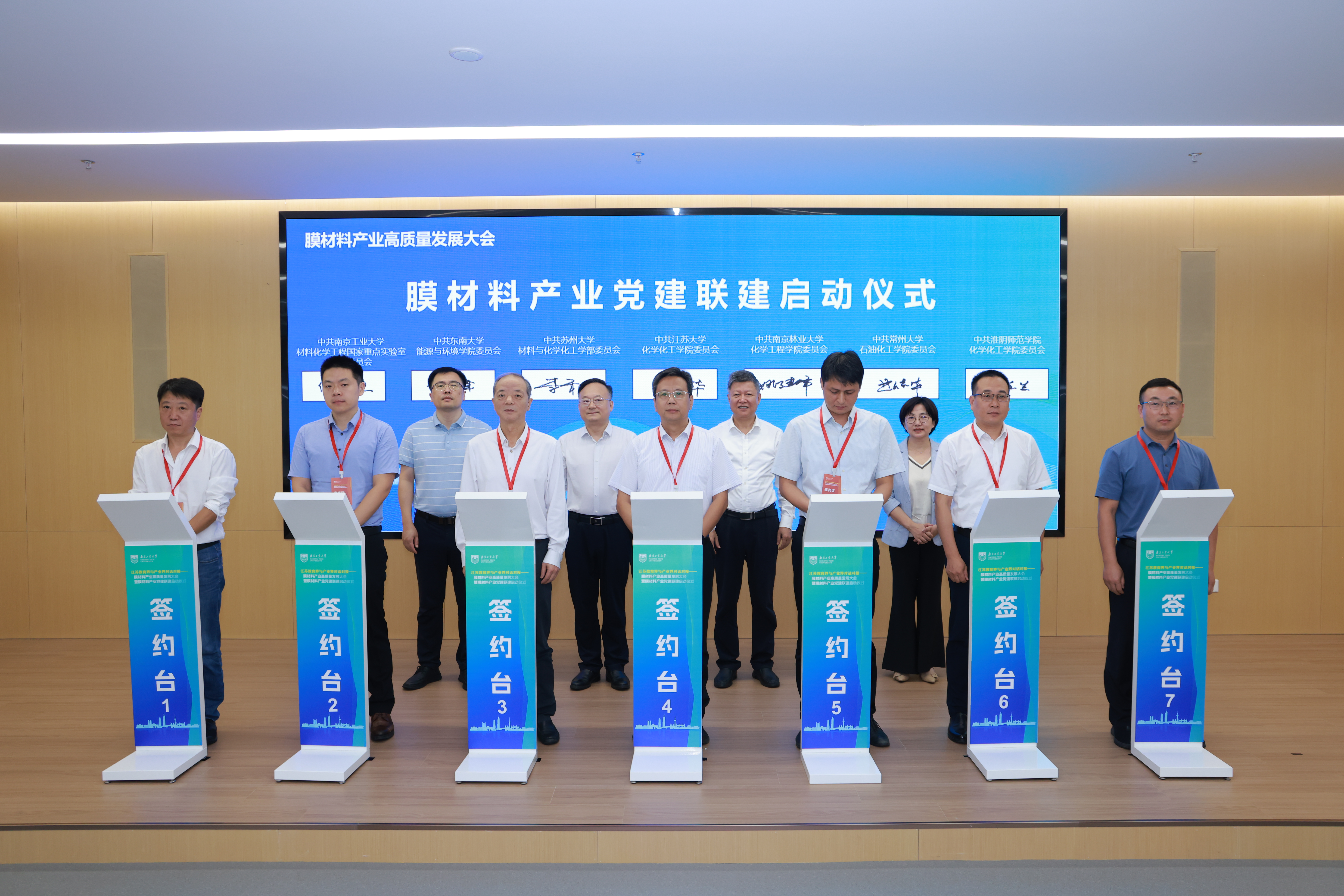 會(huì )上,來(lái)自常州大學(xué)、南京工業(yè)大學(xué)、東南大學(xué)、蘇州大學(xué)、江蘇大學(xué)、南京林業(yè)大學(xué)、淮陰師范學(xué)院等高校,南京江北新材料科技園、張家港保稅區、揚州化工園區等園區,以及南京水務(wù)集團、江蘇索普集團、南京新工集團、江蘇久吾高科、國家高性能膜材料創(chuàng )新中心等企業(yè)的15家黨組織代表現場(chǎng)簽署膜材料產(chǎn)業(yè)黨建聯(lián)建協(xié)議。