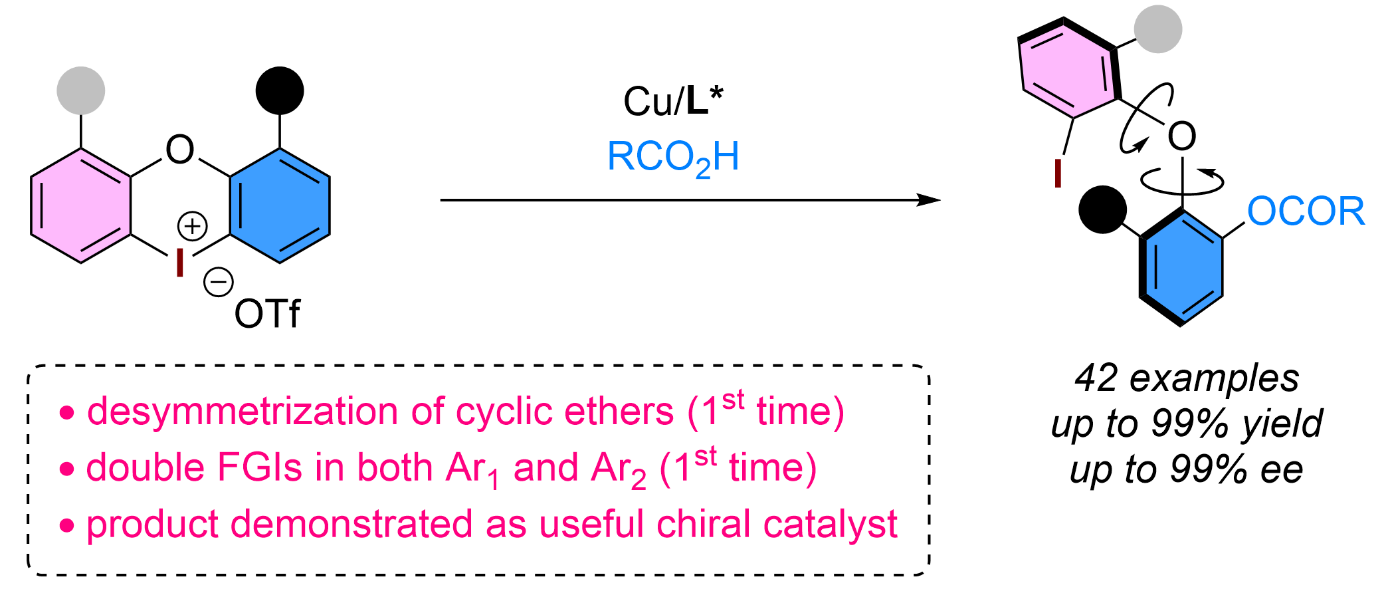 高效構建軸向手性二芳基醚(ACDEs)是有機合成中一項重要且新興但極具挑戰性的任務(wù)?,F有基于去對稱(chēng)化策略的成功案例僅限于非環(huán)芳基醚,且僅能對四個(gè)取代基中的一個(gè)進(jìn)行單一修飾,模塊化程度較低。黃海和孫建偉課題組近日首次開(kāi)發(fā)了一種雙取代基同步修飾的對映選擇性合成策略,實(shí)現了ACDEs結構的靈活多樣化構建?;诃h(huán)狀二芳基碘鎓鹽的開(kāi)環(huán)反應,建立了一種溫和的銅催化方法,在溫和條件下實(shí)現了優(yōu)異的反應效率、對映選擇性和良好的區域選擇性。所獲得的高對映體純度ACDEs產(chǎn)物可作為高效手性催化劑應用于不對稱(chēng)合成領(lǐng)域。