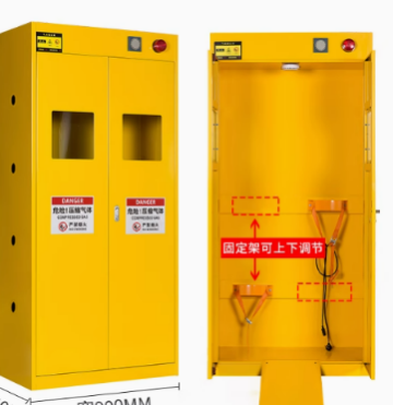1、柜體材質(zhì):1.2mm厚冷軋鋼板,環(huán)氧樹(shù)脂粉末靜電噴涂,門(mén)板內嵌3mm透明玻璃,一體鎖拉手,隱藏式不銹鋼承重合頁(yè), 配鋼瓶防倒鋼鏈,底部帶鋼搬運斜坡。