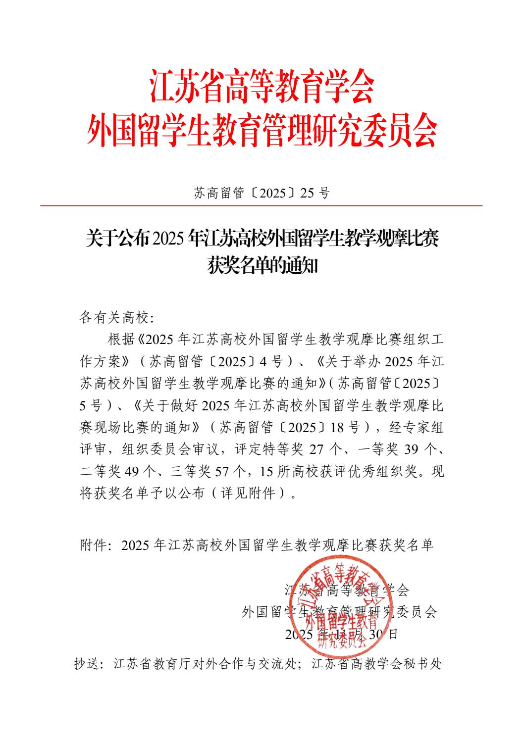 近日,江蘇省高等教育學(xué)會(huì )外國留學(xué)生教育管理研究委員會(huì )公布了2025年江蘇高校外國留學(xué)生教學(xué)觀(guān)摩比賽獲獎名單。經(jīng)過(guò)專(zhuān)家組評審和組織委員會(huì )審議,我院有機化學(xué)教研室滕巧巧老師榮獲三等獎。