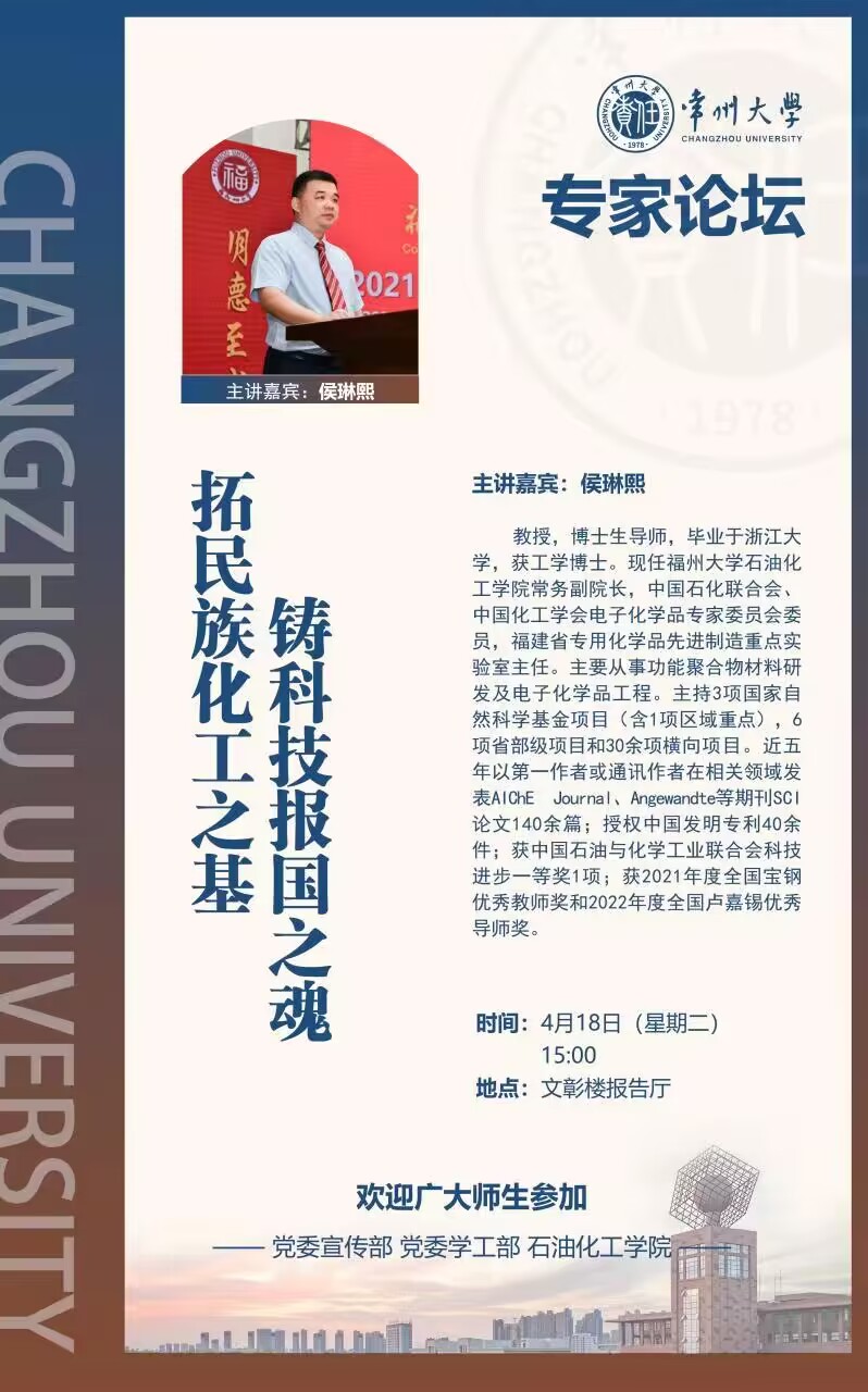 【學(xué)術(shù)講座】4月18日常州大學(xué)專(zhuān)家論壇:拓民族化工之基 鑄科技報國之魂