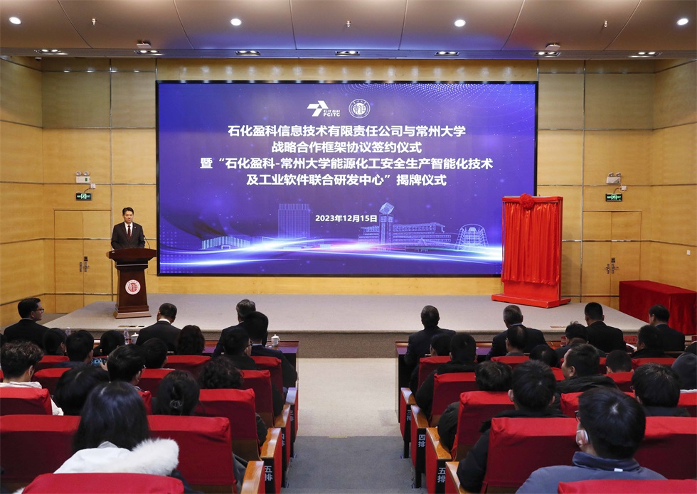 12月15日,石化盈科信息技術(shù)有限責任公司(以下簡(jiǎn)稱(chēng)“石化盈科”)與常州大學(xué)戰略合作框架協(xié)議簽約儀式暨“石化盈科-常州大學(xué)能源化工安全生產(chǎn)智能化技術(shù)及工業(yè)軟件聯(lián)合研發(fā)中心”(以下簡(jiǎn)稱(chēng)“聯(lián)合研發(fā)中心”)揭牌儀式在常州大學(xué)科教城校區文彰樓報告廳舉行。石化盈科董事長(cháng)、黨委書(shū)記周昌,黨委委員、副總裁張劉軍,常州大學(xué)黨委書(shū)記徐守坤,原黨委書(shū)記陳群,黨委副書(shū)記、校長(cháng)陳海群,副校長(cháng)晏成林出席活動(dòng)。石化盈科人力資源部、企改法律部、華東區域分公司、科技信息部、過(guò)程控制事業(yè)部,常州大學(xué)相關(guān)職能部門(mén)和學(xué)院負責人、教師和學(xué)生代表參加活動(dòng)。陳海群主持活動(dòng)。