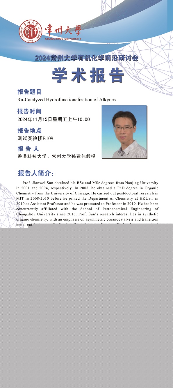 【學(xué)術(shù)報告】11月15日學(xué)術(shù)報告—孫建偉教授 香港科技大學(xué)、常州大學(xué)