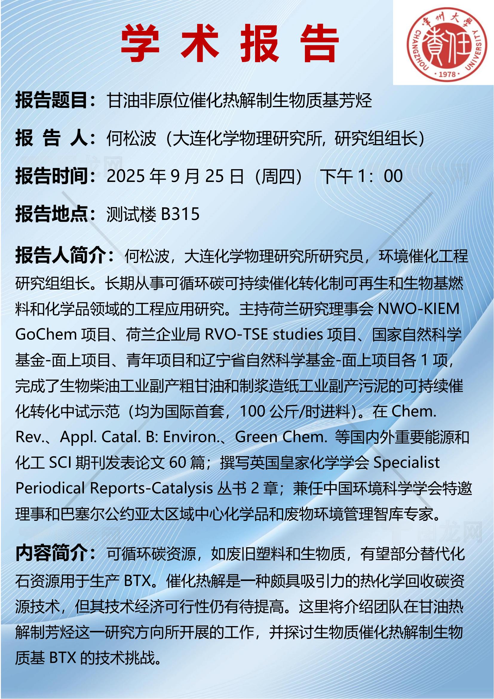 【學(xué)術(shù)報告】9月25日甘油非原位催化熱解制生物質(zhì)基芳烴
