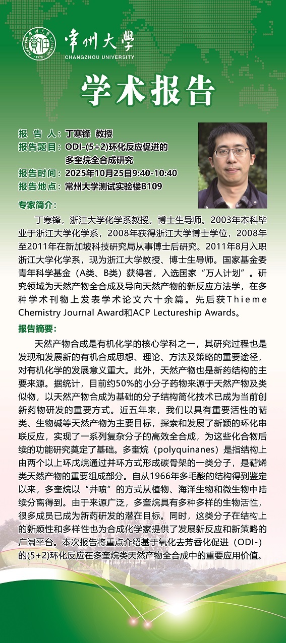| 【學(xué)術(shù)報告】10月25日功能雜環(huán)研究院學(xué)術(shù)報告——丁寒鋒教授 浙江大學(xué) 顧振華教授 中國科學(xué)技術(shù)大學(xué) |
