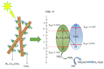 | Rational construction of direct Z-scheme doped perovskite/palygorskitenanocatalyst for photo-SCR removal of NO: Insight into the effect of Ceincorporation Xiazhang Li *, Haiyang Shi , Xiangyu Yan , ShixiangZuo , Yuying Zhang , Qun Chen , Chao Yao *,Chaoying Ni*,Journal of Catalysis 369 (2019) 190–200 原文鏈接: https://www.sciencedirect.com/science/article/pii/S0021951718304391?dgcid=author 針對脫硝催化劑低溫活性差,抗硫抗水性弱,成本高的難題,本團隊近年來(lái)嘗試將光驅動(dòng)引入傳統SCR催化脫硝體系,基于“固溶析出相”的理念,以天然凹凸棒石(坡縷石)為基體,相繼設計了Mn離子摻雜type-I型(ChemicalEngineeringJournal, 2017, 320, 211-221),Ni離子摻雜type-II型photo-SCR催化劑(Applied Catalysis B: Environmental,2018,231, 92–100),巧妙解決了光生載流子易復合的難題,并構建了石墨烯介質(zhì)的間接Z-Scheme(Journal of Catalysis,2018,357,59–68),氮摻雜碳量子點(diǎn)修飾的直接Z-Scheme催化劑(ACS Sustainable Chem. Eng, 2018, 6,6, 10616?10627),解決了光生電荷遷移后氧化還原活性變差的難題。本工作在此基礎上,在鈣鈦礦中引入Ce離子,通過(guò)費米能級的調控引導在凹凸棒石表面形成摻雜PrFeO3/CeO2直接Z-Scheme“固溶析出相”異質(zhì)結,無(wú)須傳導介質(zhì),有效提升了光能吸收,保持了高氧化還原活性的同時(shí)表現出良好的低溫抗硫抗水性。該工作得到了國家自然科學(xué)基金(51674043)和江蘇省國際科技合作項目(BZ2015040)的資助,同時(shí)得到了美國特拉華大學(xué)電鏡中心主任倪超英教授的大力支持。