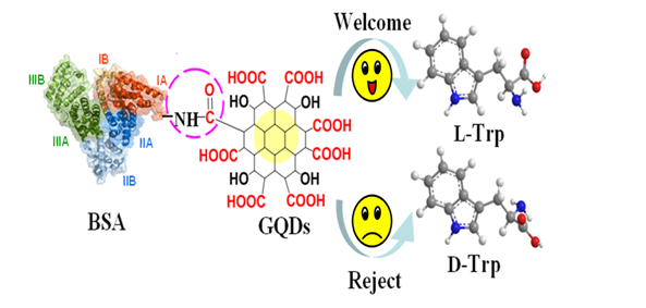 Covalent Functionalization of Bovine Serum Albumin with Graphene Quantum Dots for Stereospecific Molecular RecognitionQiumin Ye, Lili Guo, Datong Wu, Baozhu Yang, Yongxin Tao, Linhong Deng, Yong Kong* 原文鏈接:https://pubs.acs.org/doi/10.1021/acs.analchem.9b02605 牛血清白蛋白(BSA)是一種研究廣泛的血清蛋白,因其具有易溶、成本低、生物相容性高等優(yōu)點(diǎn)已引起研究者的廣泛關(guān)注。近日,課題組制備了BSA 與石墨烯量子點(diǎn)(GQDs)的復合材料,并將其成功應用于色氨酸(Trp)對映體的電化學(xué)識別。GQDs與BSA之間的酰胺化反應形成的酰胺鍵破壞了BSA原有的規整形貌,改變了BSA整體肽鏈的空間構型,使BSA分子原本的三維心形結構得以擴展,從而使肽鏈上的手性中心更易于暴露,提高了BSA-GQDs復合物的識別效率。