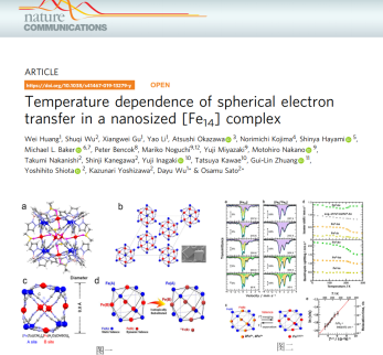 近日,我校石油化工學(xué)院吳大雨教授團隊在合成和表征新型無(wú)機納米團簇及其電子行為研究方面取得重要進(jìn)展,在Nature Communications(自然通訊)發(fā)表了題為“Temperature dependence of spherical electron transfer in a nanosized [Fe14] complex”(DOI: 10.1038/s41467-019-13279-y)的原創(chuàng )性論文(文章鏈接:https://www.nature.com/articles/s41467-019-13279-y)。Nature Communications期刊是Nature出版集團旗下的國際頂級綜合性學(xué)術(shù)期刊,該項成果以常州大學(xué)為第一署名單位。近年來(lái),吳大雨教授課題組致力于分子基材料跨學(xué)科研究,所涉及的學(xué)科方向包括化學(xué)、材料學(xué)、物理學(xué)與光電子等。該項工作應用金屬-有機自組裝策略,合成了高核鐵原子納米團簇,通過(guò)精準調控團簇表面的自由電子觀(guān)察分子水平上多電子轉移,顯示出分子基材料在電子轉移活性催化材料、單分子磁體、高密度信息存儲等領(lǐng)域的巨大應用潛力。其亮點(diǎn)不僅在于成功合成氰橋高核鐵納米團簇,同時(shí)結合多種表征方法和理論計算清晰表征團簇球殼表面的電子轉移活性位點(diǎn),其作為電子化合物屬性是一類(lèi)具有特殊性能的量子材料,其中過(guò)剩電子被限域在團簇殼層表面并充當陰離子,對電子傳輸和材料的催化、電磁等性能起關(guān)鍵作用。