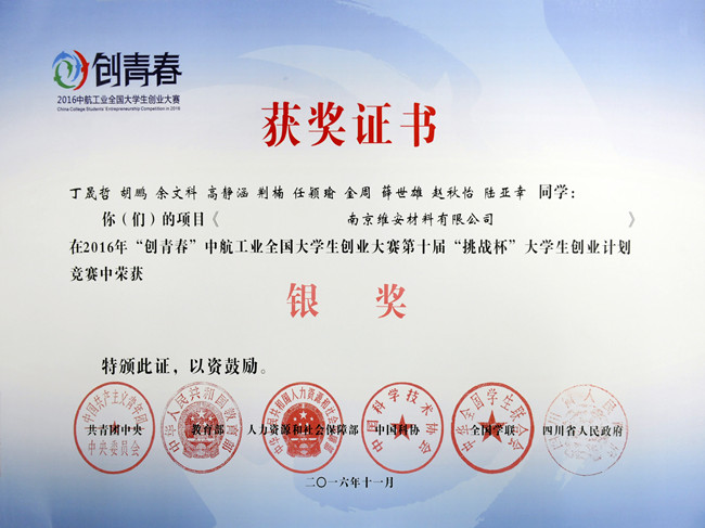 | The National College Students' Entrepreneurship Competition came to an end at the University of Electronic Science and Technology of China on November 19, 2016. In the finals, our entrepreneurial team from Changzhou University, Changzhou Weian Materials Co., Ltd., won a silver medal in the entrepreneurial practice competition. This is a major breakthrough of our school for The National College Students' Entrepreneurship Competition. By taking part in these entrepreneurial practice competitions, we can promote disciplinary building and development, train students' innovative spirit and improve the students' innovative ability.